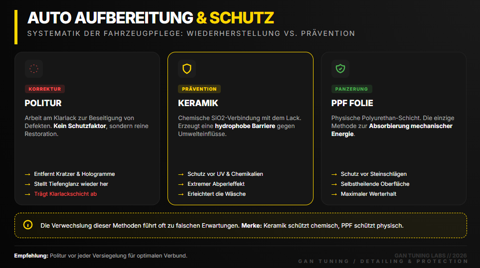 Politur – Arbeit am vorhandenen Lack. Entfernt Kratzer, Hologramme und Mattigkeit. Das ist Wiederherstellung, kein Schutz. Bei zu häufiger Anwendung wird der Klarlack schneller dünner.