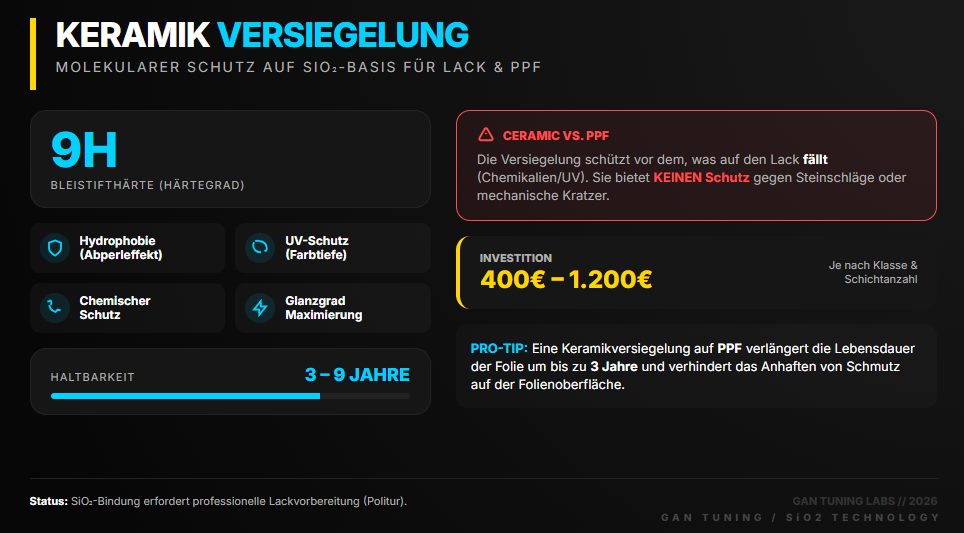 Kosten in Deutschland: Professionelles Auftragen einer Keramikversiegelung Auto kostet je nach Fahrzeugklasse und Produkt €400–€1.200. Eine zusätzliche Keramikversiegelung auf PPF kostet ebenfalls €400–€1.200 und kann die Lebensdauer der Folie von 5–7 auf 7–10 Jahre verlängern.