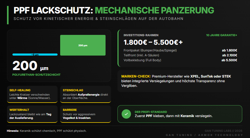 Ein wesentlicher Punkt: Ceramic coating ist eine Schicht von 1–6 µm. Ceramic coating schützt vor dem, was auf den Lack fällt – PPF schützt vor dem, was dagegen prallt. Steinschläge, physische Kratzer, Dellen – dagegen ist ceramic coating wirkungslos. Das ist der Aufgabenbereich der Lackschutzfolie (PPF).