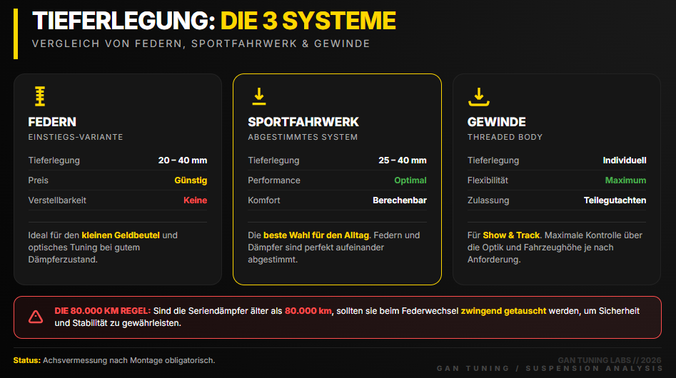 Drei Hauptvarianten zum Auto tieferlegen auf dem deutschen Markt — jede mit ihrer eigenen Logik.