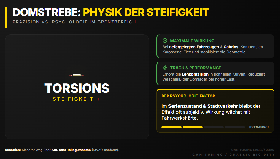 Bei einem seriennahen Fahrzeug mit mehr als 150 PS, unverändertem Fahrwerk, im Stadtverkehr und entspannter Autobahnfahrt — wird der Unterschied höchstwahrscheinlich subjektiv bleiben. Die deutsche Automobilcommunity gibt offen zu: Der Effekt der Domstrebe wächst mit der Fahrwerkshärte und der Intensität der Belastung. Im Serienfahrwerk — fraglich. Bei versteiftem, tiefergelegtem und chipgetuntem Fahrzeug — eine andere Aussage.