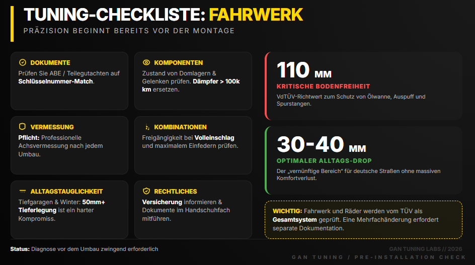 Restfederweg und Bodenfreiheit. Nach der Montage ausreichend Federweg bis zu den Puffern sicherstellen und prüfen, ob harte Bauteile (Ölwanne, Auspuffanlage, Spurstangen) nicht kritisch nah an den Boden kommen. Der Test an der „110-mm-Barriere“ ist nicht nur eine TÜV-Anforderung, sondern auch ein praktischer Schutz vor Schäden an Parkhauseinfahrten.