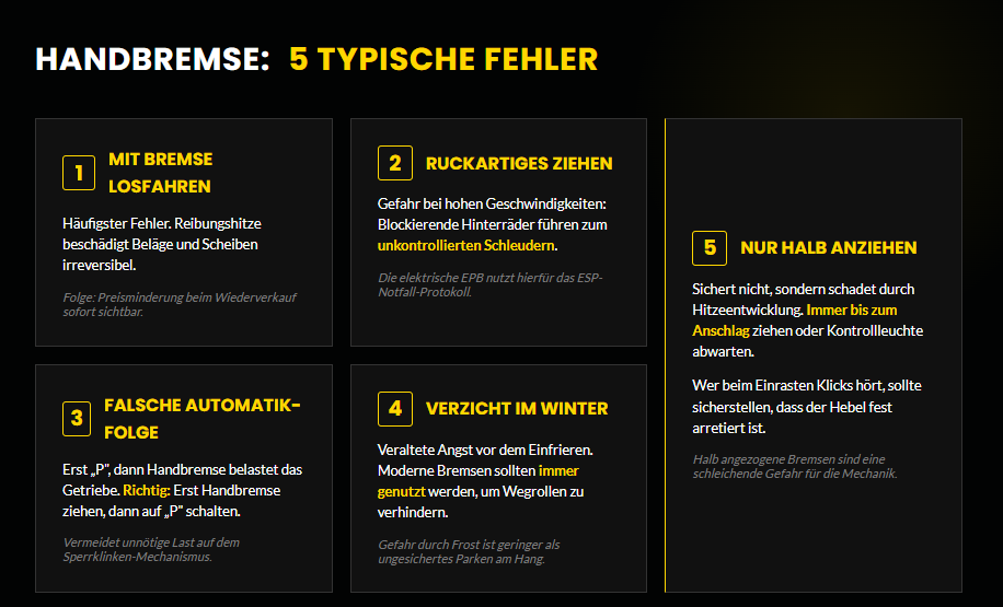 Fehler 2: Handbremse bei hoher Geschwindigkeit ruckartig ziehen. Auf der Autobahn besonders gefährlich. Das Blockieren der Hinterräder führt zum Schleudern. Hersteller warnen in den Betriebsanleitungen ausdrücklich davor. Die elektrische EPB funktioniert im Notfallmodus anders – gesteuert über das ESP und damit kontrolliert –, aber das ist ein Ausnahmeszenario, kein Alltagsgebrauch.