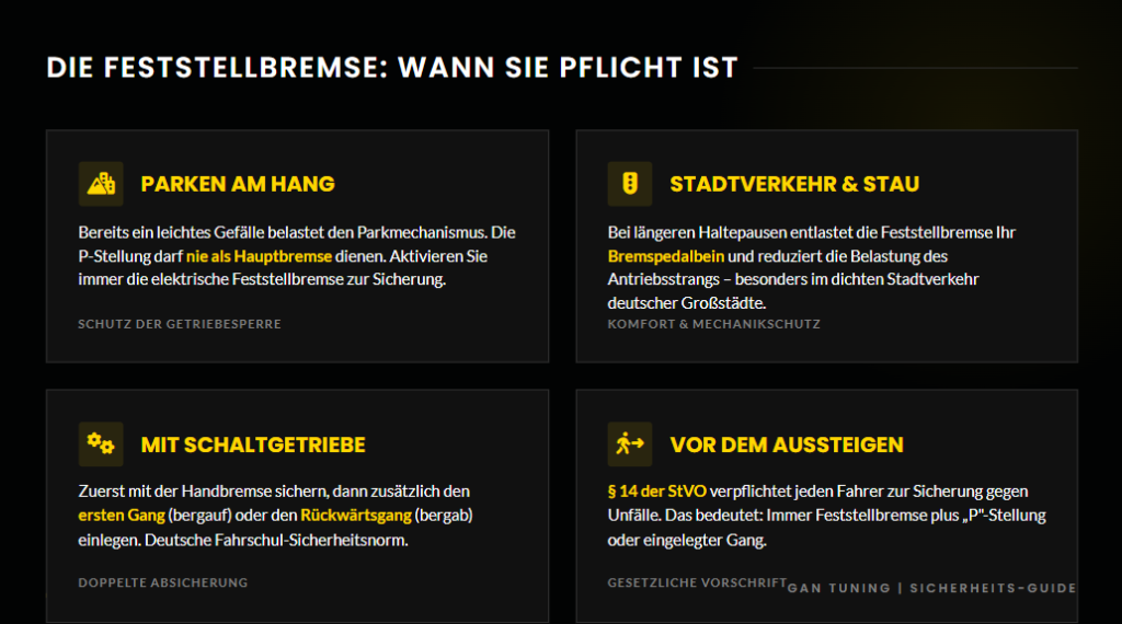 Es gibt Situationen, in denen der Einsatz der Feststellbremse keine Empfehlung ist, sondern schlicht notwendig.