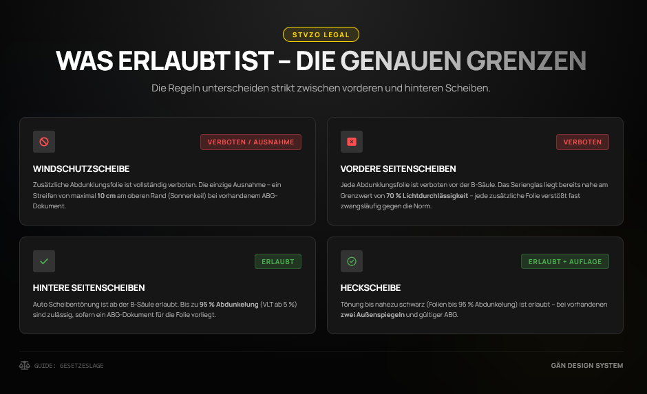 Realität: Nein. Auch eine professionell angebrachte Folie auf den Frontscheiben bleibt illegal. Die Rechtmäßigkeit bestimmt sich nach dem Anbaubereich und dem Vorhandensein einer ABG – nicht nach der Montagequalität.