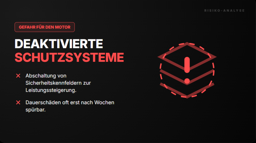 - Erstens: Die Schutzsysteme. Um mehr Leistung rauszuholen, deaktivieren viele Tuner die Motor-Schutzsysteme. Oder verändern sie so, dass sie nicht mehr richtig funktionieren. Das kann gut gehen. Oder der Motor nimmt Schaden. Merken tun Sie’s vielleicht erst nach Wochen.